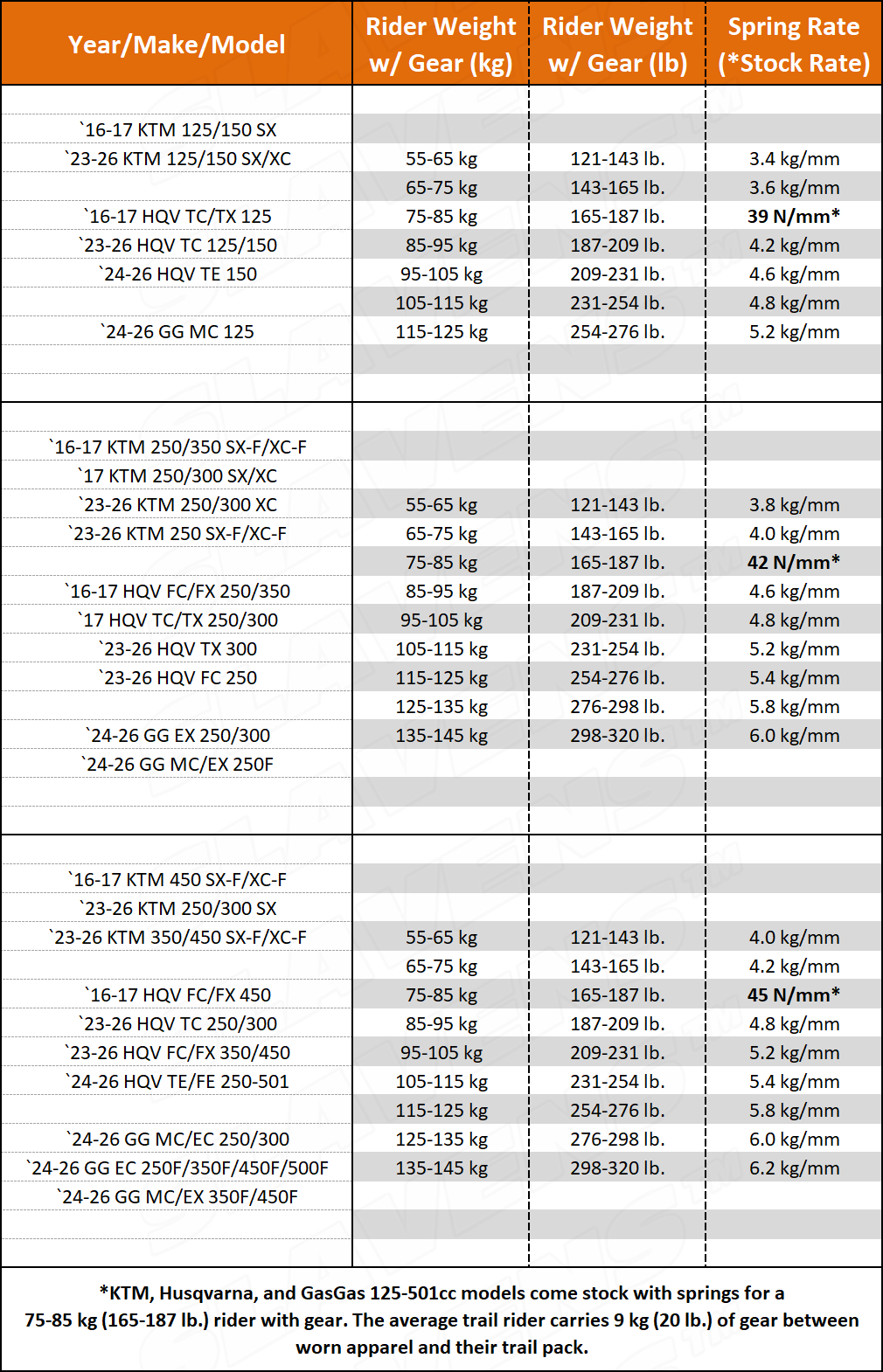 Slavens Racing shall not be liable for any loss, damage, injury, or death arising from the use of this product. User assumes ALL responsibility and risk. Motorcycle Riding/Racing is an inherently DANGEROUS activity. All spring rates and part numbers are suggestions only.